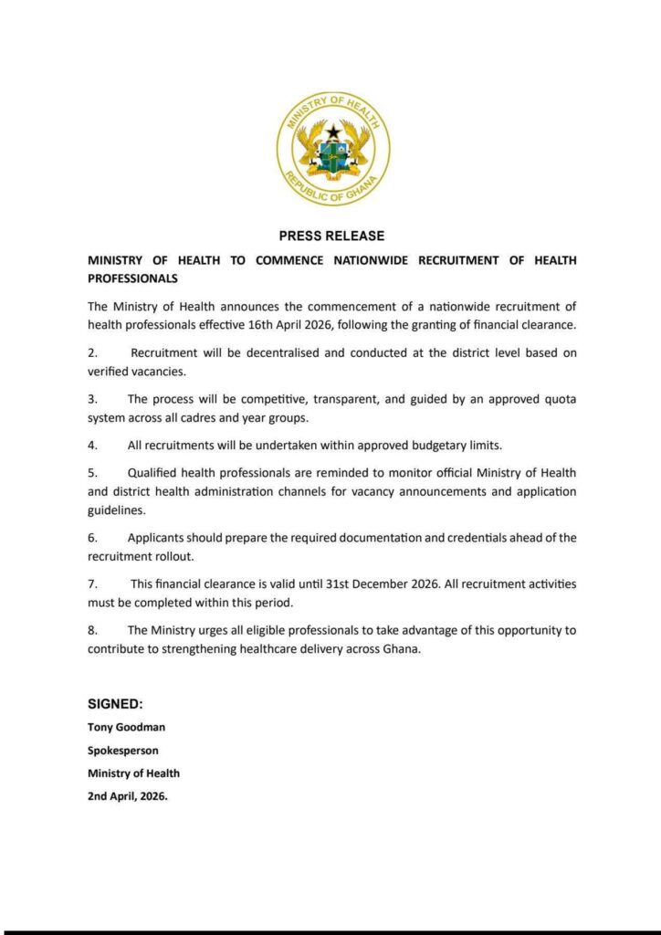 Ministry of Health has Announced Massive Health Recruitment Exercise following the clearance by Finance Minister.