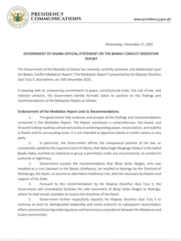 In an official statement released on Wednesday, December 17, and signed by the Spokesperson to the President, Felix Kwakye Ofosu, the government accepted all recommendations in the report presented a day earlier, affirming the Supreme Court’s position on the rightful Bawku overlord.